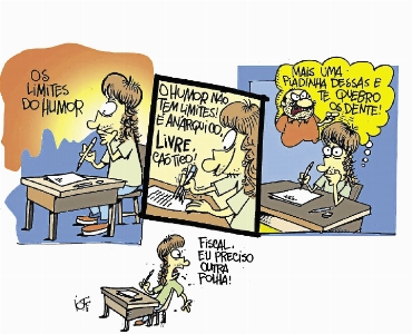 Os candidatos a uma das vagas da Universidade Federal do Rio Grande do Sul (UFRGS) riram porque, durante a prova de redação do vestibular, foram convidados a refletir sobre o papel e os limites do humor na sociedade e, invariavelmente, tiveram de revirar a caixola em busca de exemplos engraçados. Também encontraram no tema uma luz sorridente de tranquilidade, não uma paisagem. Não houve nada como o assustador Adamastor, da prova do ano passado. Como repórter, caí na gargalhada ao ouvir de Carlos Henrique Iotti, responsável pelo cartum desta página, que poderia escrever cartunista ou vigarista para identificá-lo nesta reportagem. Devido ao politicamente correto, implícito na discussão proposta pela universidade, preferi cartunista.